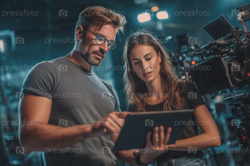 Молодой мужчина и женщина просматривают кадры фильма на цифровом планшете