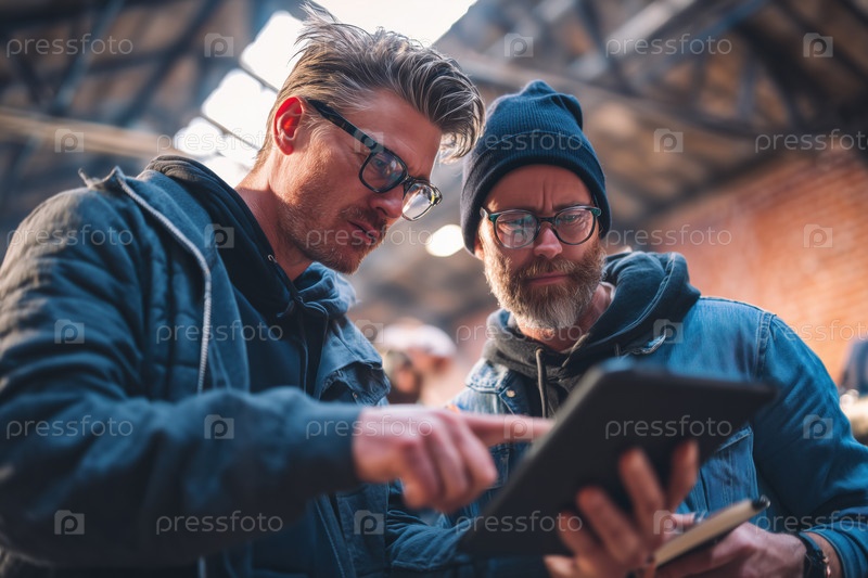 Мужчины среднего возраста сотрудничают, используя цифровые планшеты в помещении