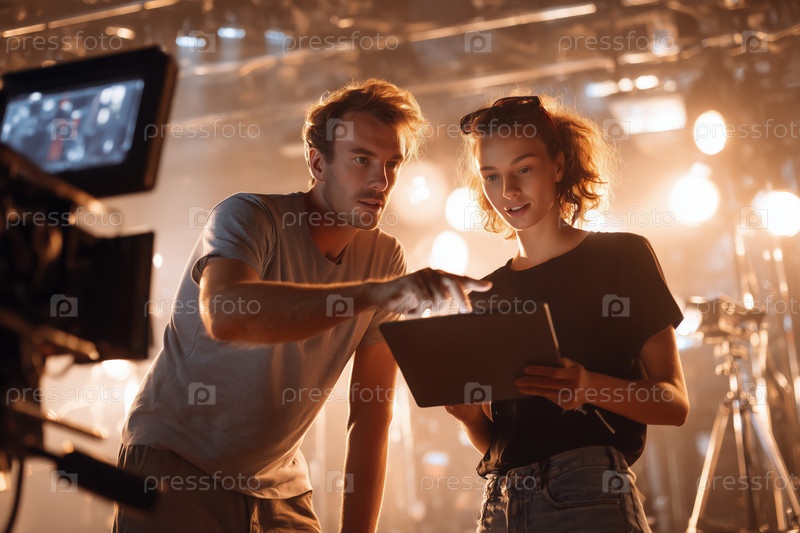 Молодой мужчина и женщина сотрудничают на съемочной площадке с помощью цифрового планшета