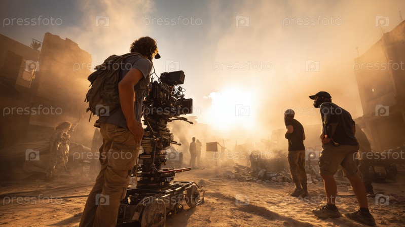 Мультиэтническая съемочная группа снимает экшн-сцену на открытом воздухе Фильм, сделанный на закате