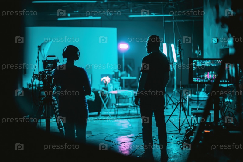 Молодой мужчина и женщина, сотрудничающие в производстве фильма Young Man and Woman Collaborating on Film Production Set Indoors