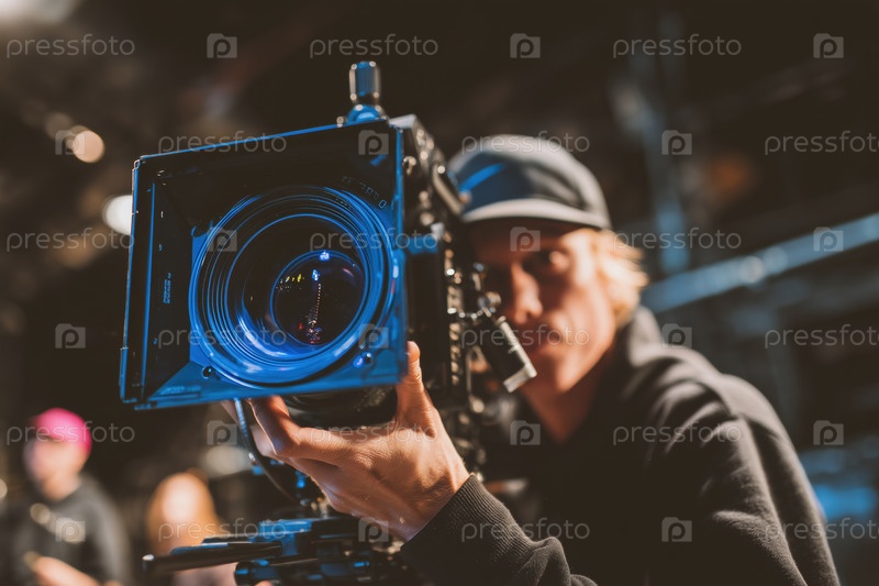 Молодой человек, работающий с профессиональной видеокамерой во время кинопроизводства