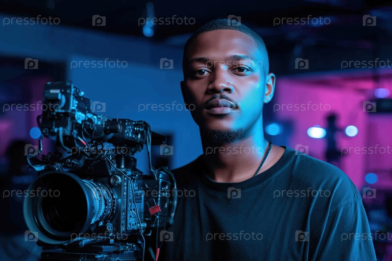 Портрет молодого чернокожего мужчины, работающего с профессиональной видеокамерой в помещении