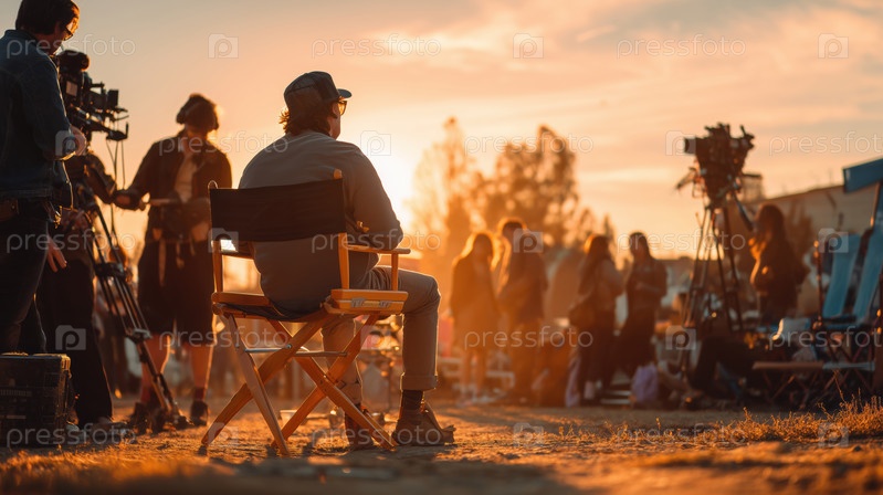 Мужчина среднего возраста, сидящий на стуле режиссера и курирующий производство фильмов