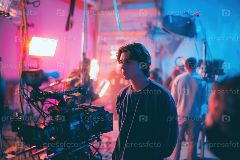 Молодой человек стоит рядом с кинокамерой, наблюдая за производством фильма