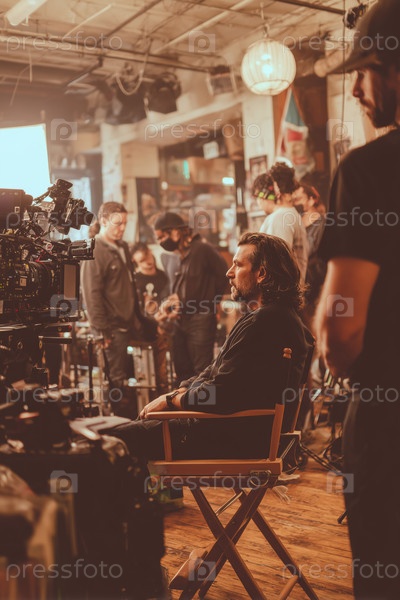 Мужчина среднего возраста, сидящий в режиссерском кресле и курирующий кинопроизводство