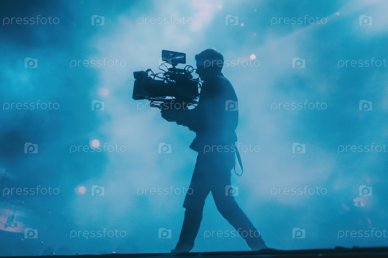 Силуэт молодого человека, работающего с профессиональной видеокамерой