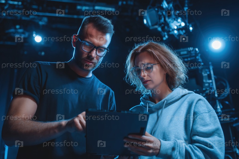 Молодой мужчина и женщина сотрудничают над цифровым планшетом в студии