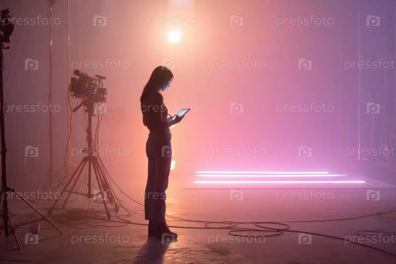Молодая женщина использует цифровой планшет на съемочной площадке