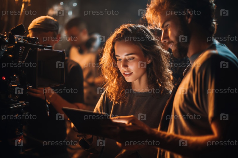 Молодая женщина сотрудничает с молодым человеком на съемочной площадке