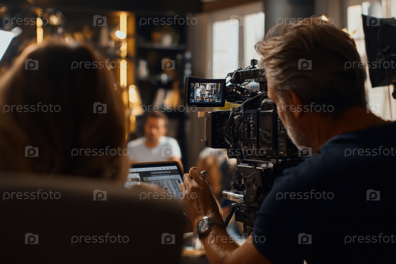 Мужчина средних лет работает с профессиональной видеокамерой во время съемок
