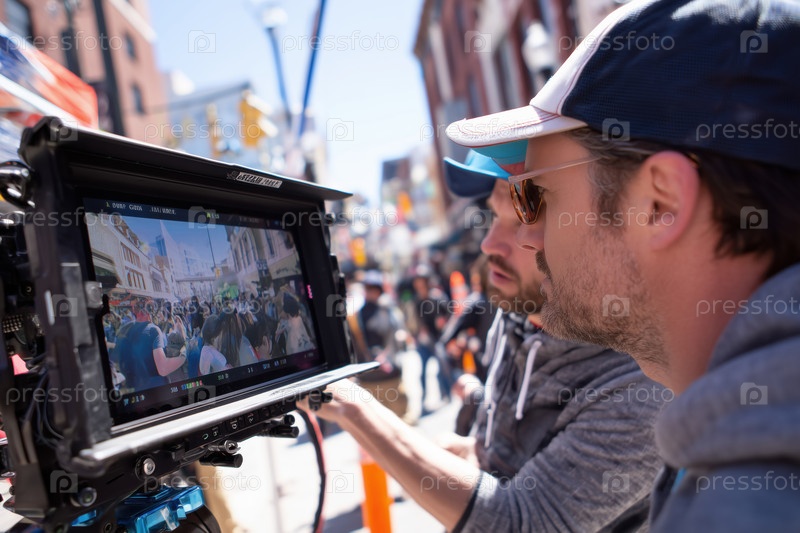 Молодые мужчины снимают городскую сцену на открытом воздухе с помощью профессиональной камеры