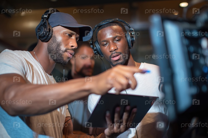Молодые чернокожие мужчины сотрудничают в производстве фильмов с использованием цифровых планшетов