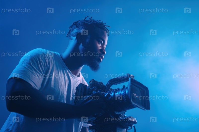 Молодой чернокожий мужчина регулирует профессиональную кинокамеру под синим освещением