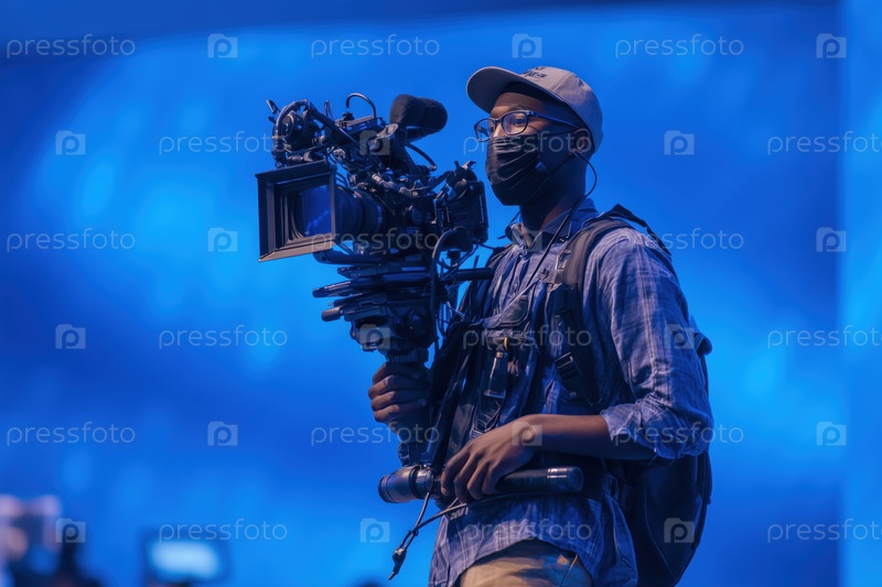 Молодой чернокожий мужчина работает с профессиональной видеокамерой на съемочной площадке