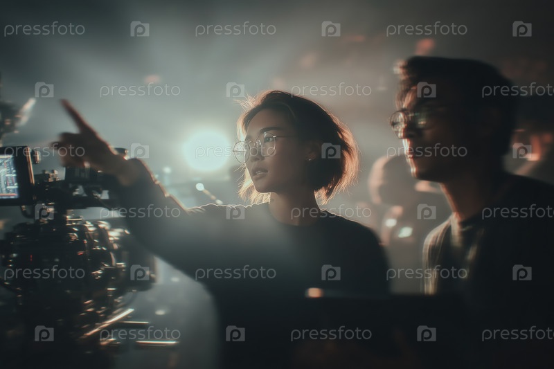 Молодая азиатская женщина направляет съемочную группу с камерным оборудованием на съемках