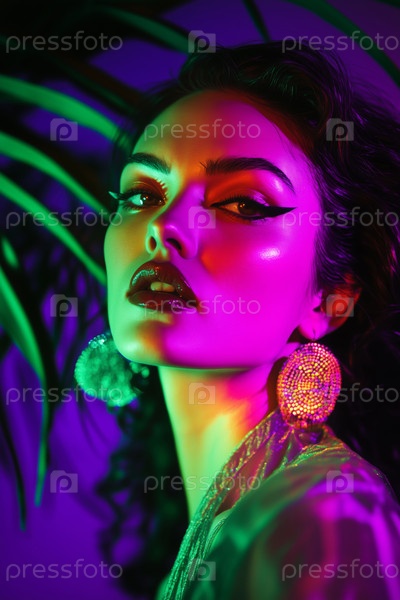 Портрет молодой взрослой женщины, позирующей под ярким неоновым освещением