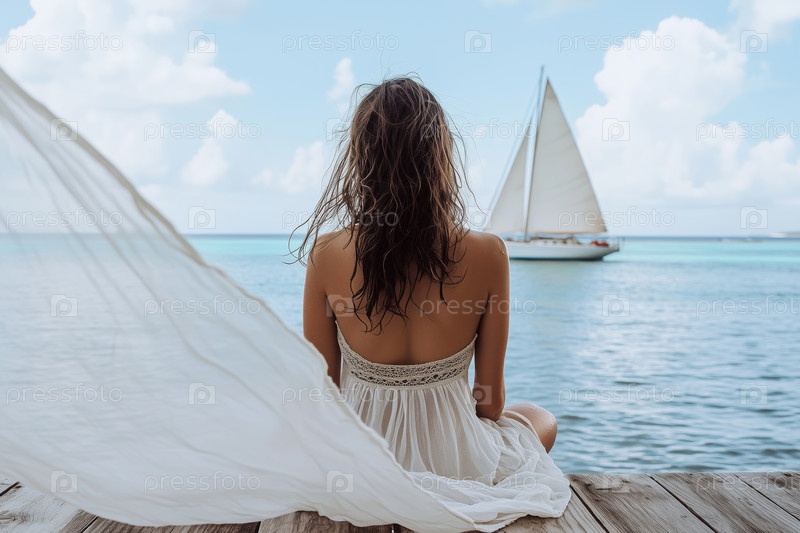 Молодая женщина отдыхает у океана, наблюдая за проходящим парусом