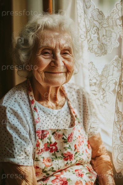 Портрет пожилой женщины, улыбающейся, сидящей возле окна