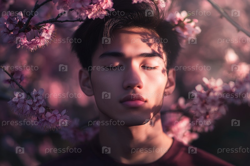 Портрет молодого азиатского мужчины, расслабляющегося с закрытыми глазами среди цветов вишни