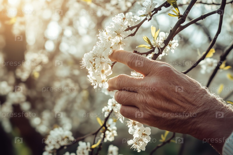 Старший мужчина прикасается к цветущей ветке дерева на улице весной
