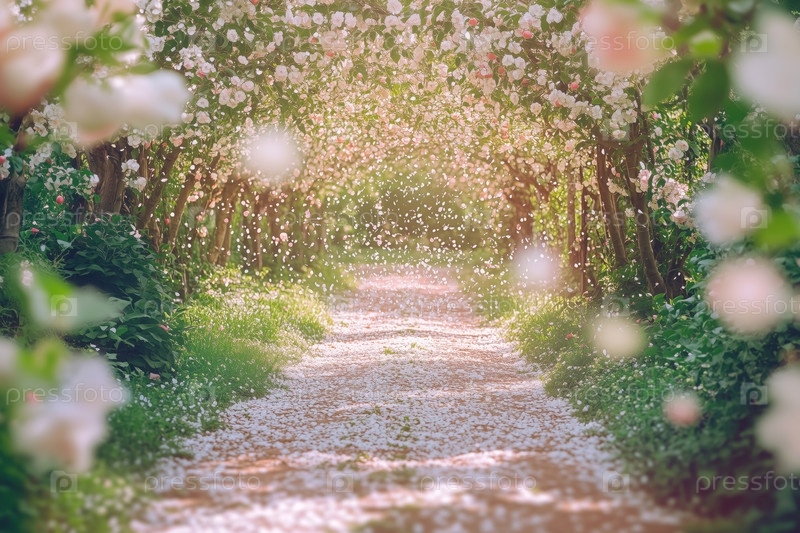 Цветущие ветви деревьев образуют туннель над дорожкой во время весеннего цветения