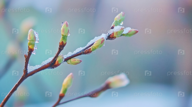 Ветка с молодыми почками, выходящими из льда во время ранней весенней утренней елки