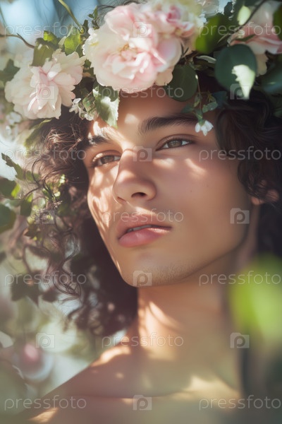 Портрет молодого взрослого мужчины, носящего цветочную корону на открытом воздухе