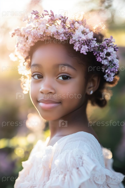 Портрет молодой чернокожей девушки, улыбающейся на открытом воздухе и носящей цветочный головной убор