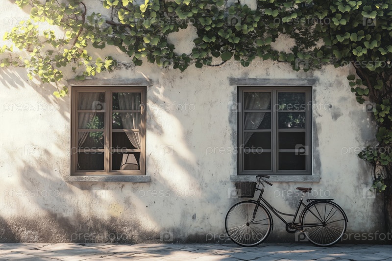 Винтажный велосипед, опирающийся на стену с плющами, растущими рядом с окнами