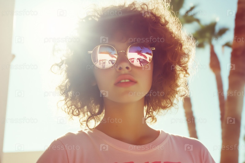 Портрет молодой взрослой женщины в солнцезащитных очках на улице под солнечным светом
