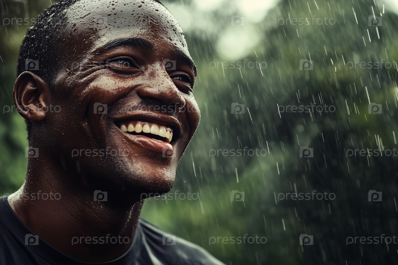 Портрет молодого взрослого чернокожего мужчины, улыбающегося на улице во время дождя