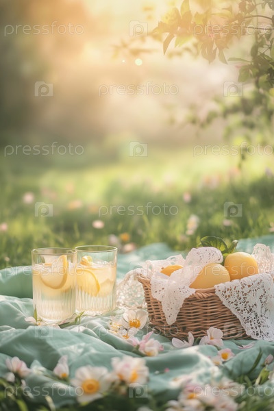 Освежающая лимонада и свежие лимоны, сидящие на пикничном одеяле в открытом воздухе