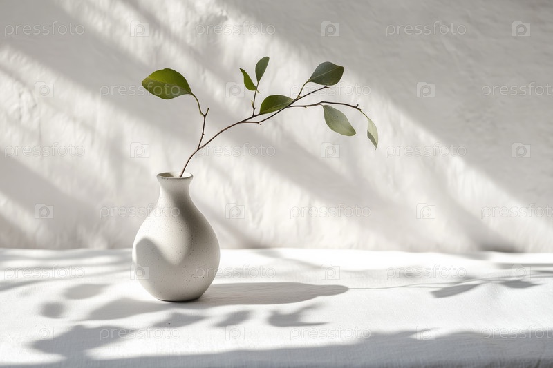Минималистская керамическая ваза, удерживающая ветви эвкалипта, литая тень в помещении