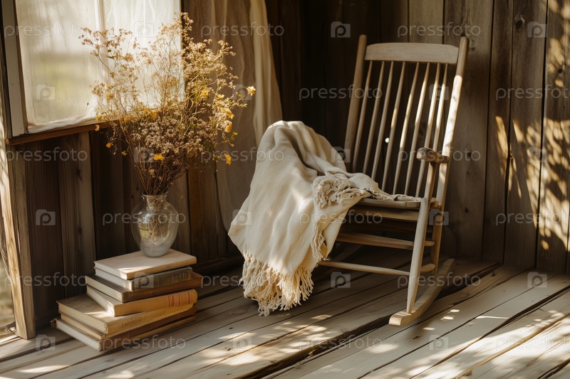 Пустой деревянный качальный стул с одеялом, сидящий рядом с сушеными цветами в помещении