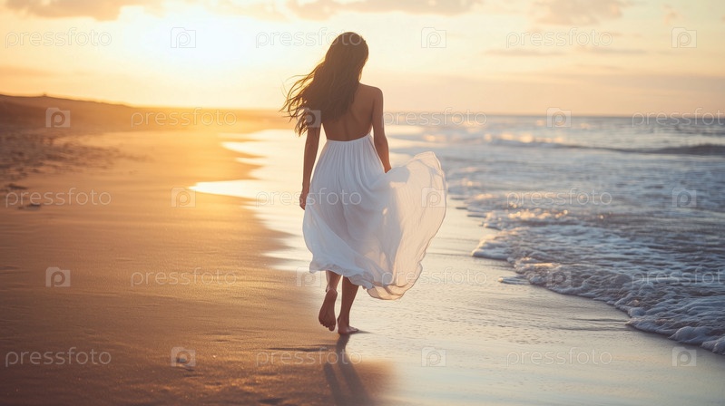 Молодая взрослая женщина гуляет вдоль пляжной береговой линии во время захода солнца