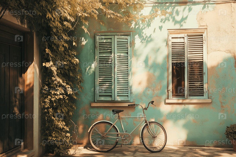 Винтажный велосипед, опирающийся на бирюзовую стену под летним солнечным светом