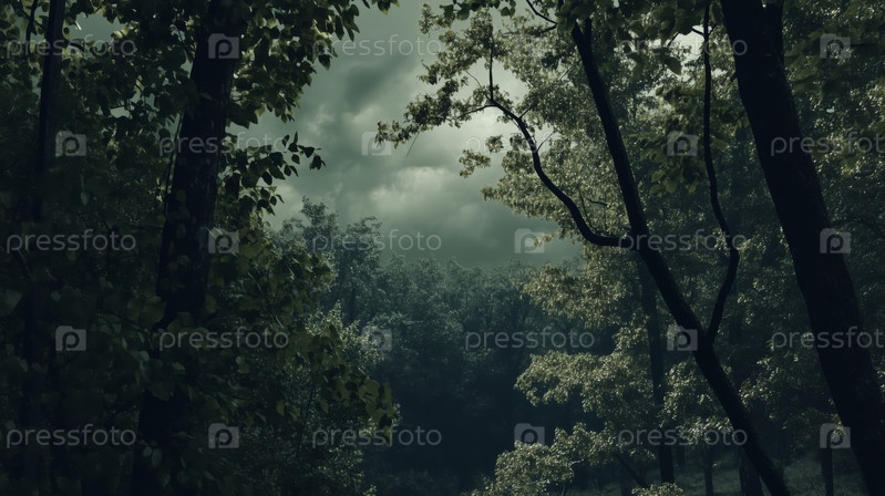 Густые лесные деревья качаются под облачным небом во время раннего утреннего света