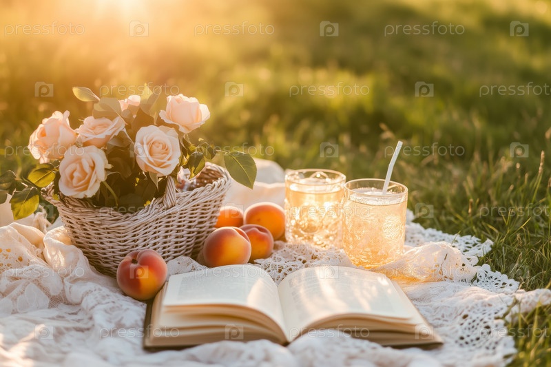 Летний пикник с открытой книгой, персиками, цветами и перекусами