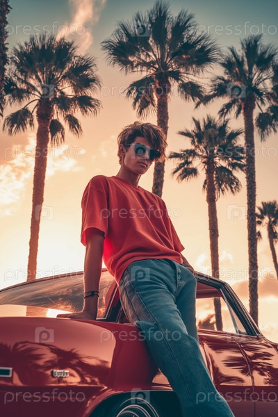 Молодой человек, опирающийся на автомобиль, уверенно позирует в Sunset Outdoors
