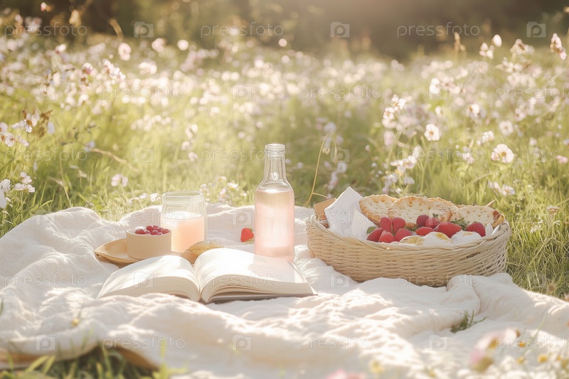 Корзина для пикника со клубникой и соком, сидящая на одеяле в открытом воздухе