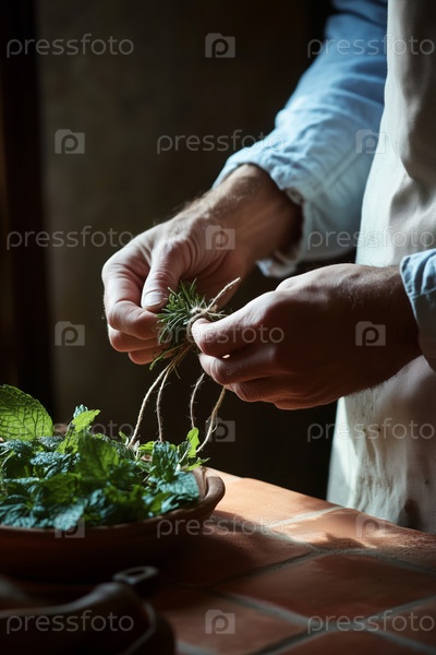 Мужчина средних лет связывает свежие травы с твином на деревенской кухне