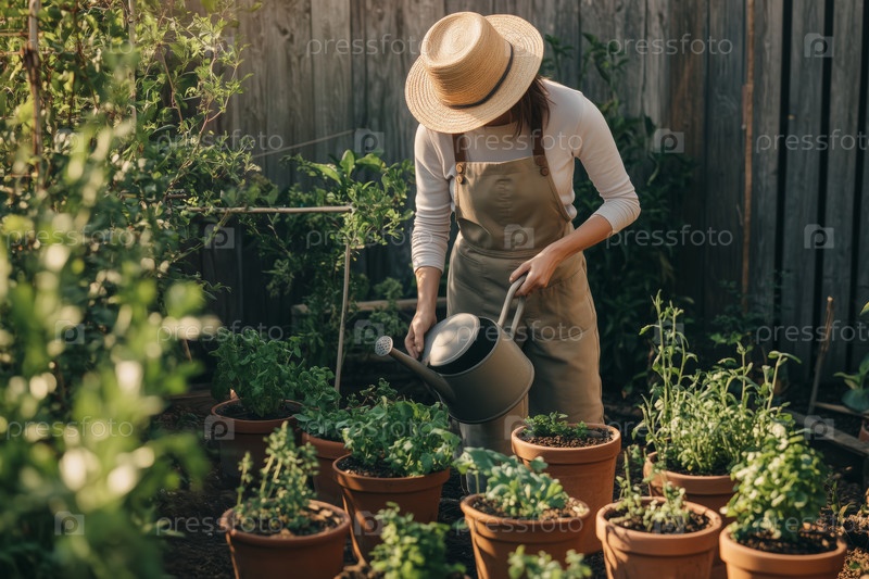 Молодая взрослая женщина поливает растения в заднем дворе овощного сада