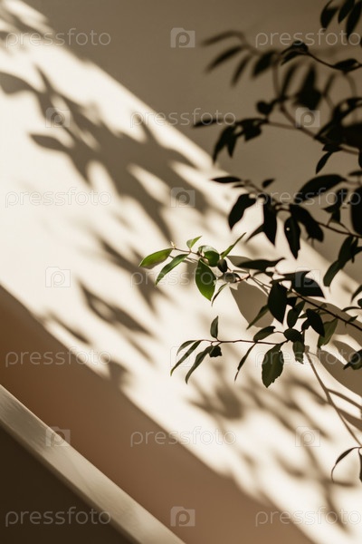 Растительные ветви отбрасывают тени на стене в естественном зеленом солнечном свете внутри