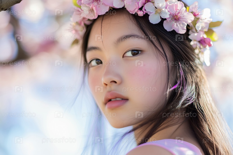 Портрет молодой азиатской женщины, носящей цветочную корону на улице весной