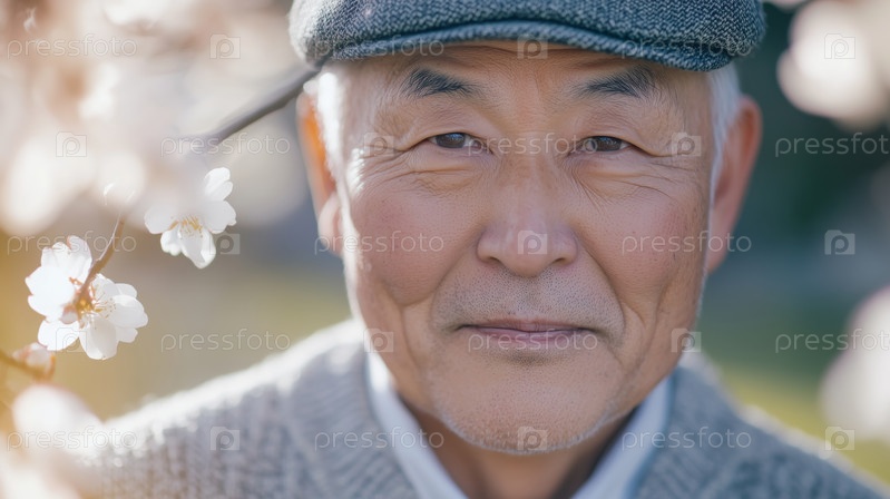Портрет старшего азиатского мужчины, улыбающегося на открытом воздухе среди цветущих вишневых цветков