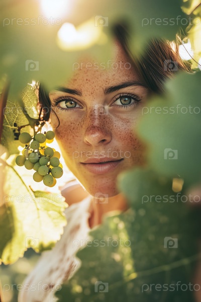 Портрет молодой женщины, глядящей на листья виноградника на открытом воздухе