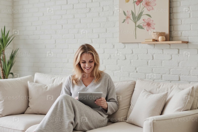 Молодая женщина сидит на диване с помощью цифрового планшета и улыбается