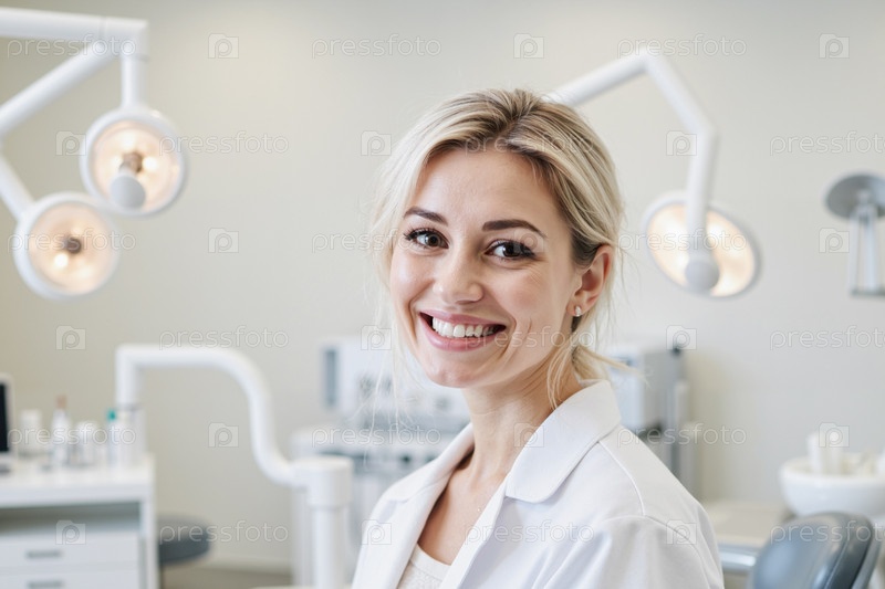 Портрет молодой взрослой женщины, улыбающейся в условиях стоматологической клиники