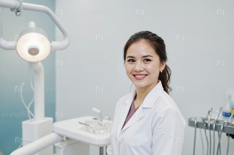 Портрет молодой взрослой азиатской женщины, улыбающейся уверенно в стоматологической клинике